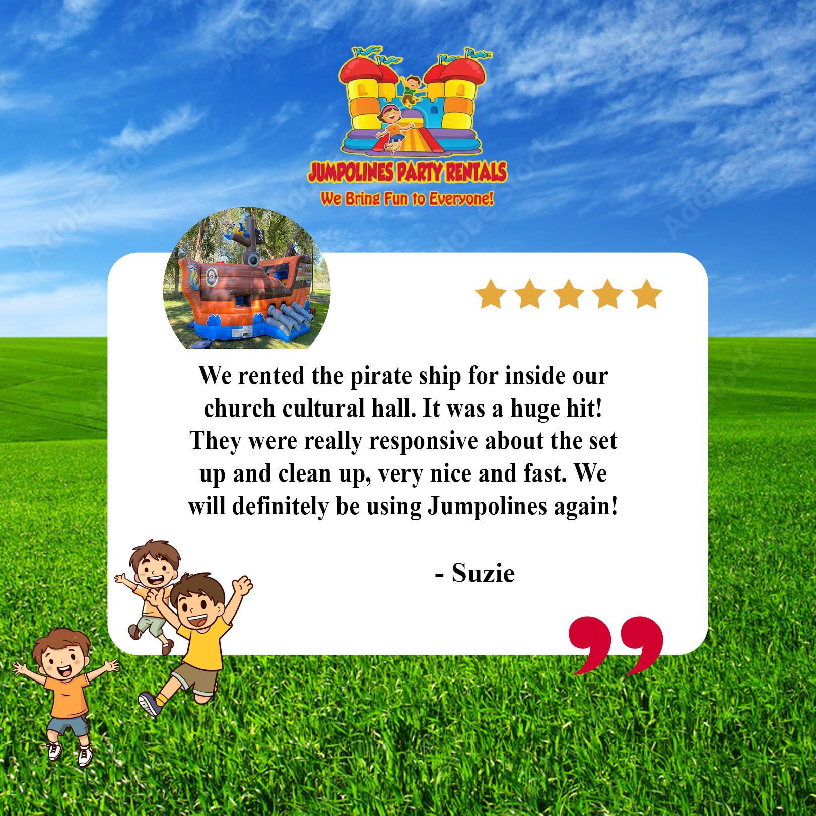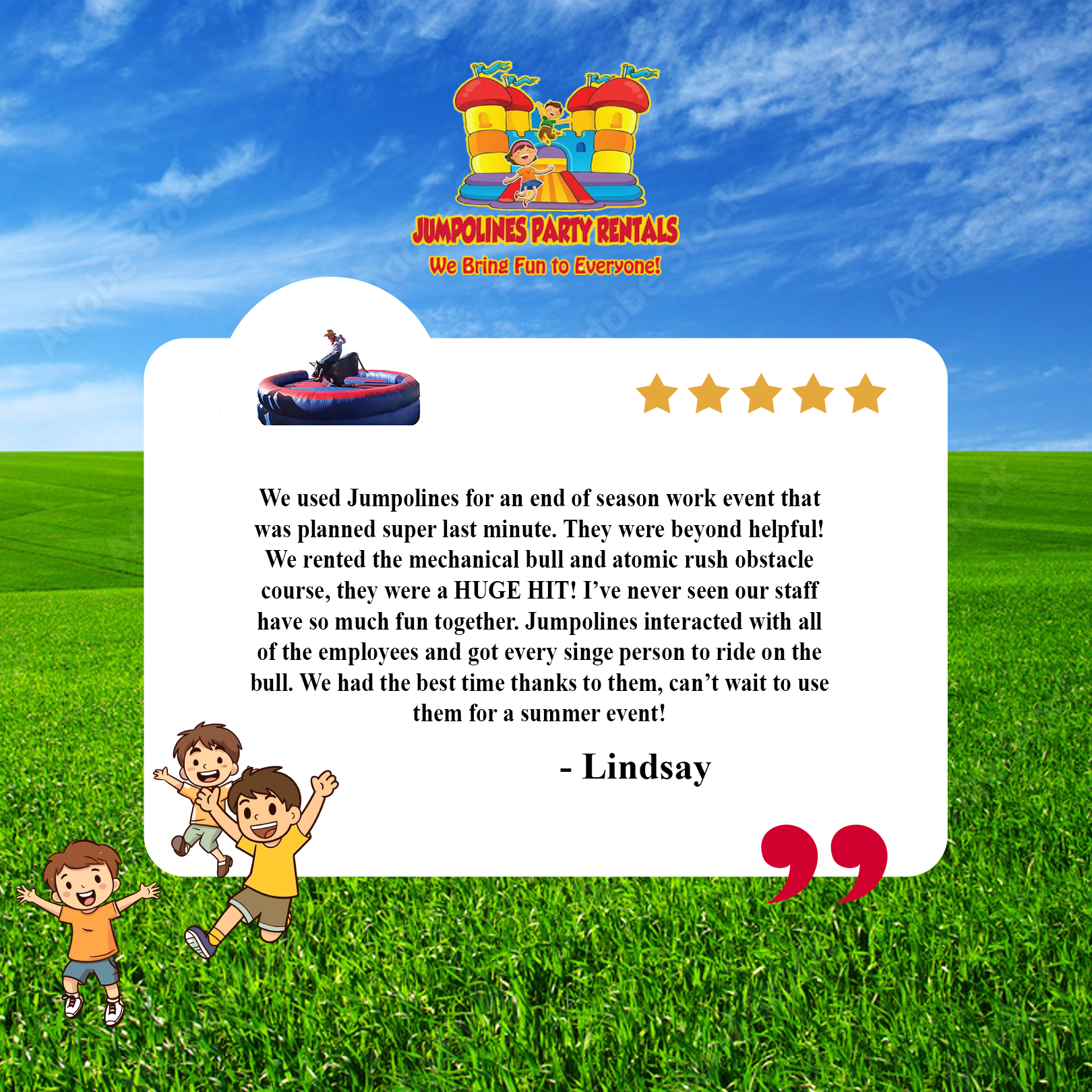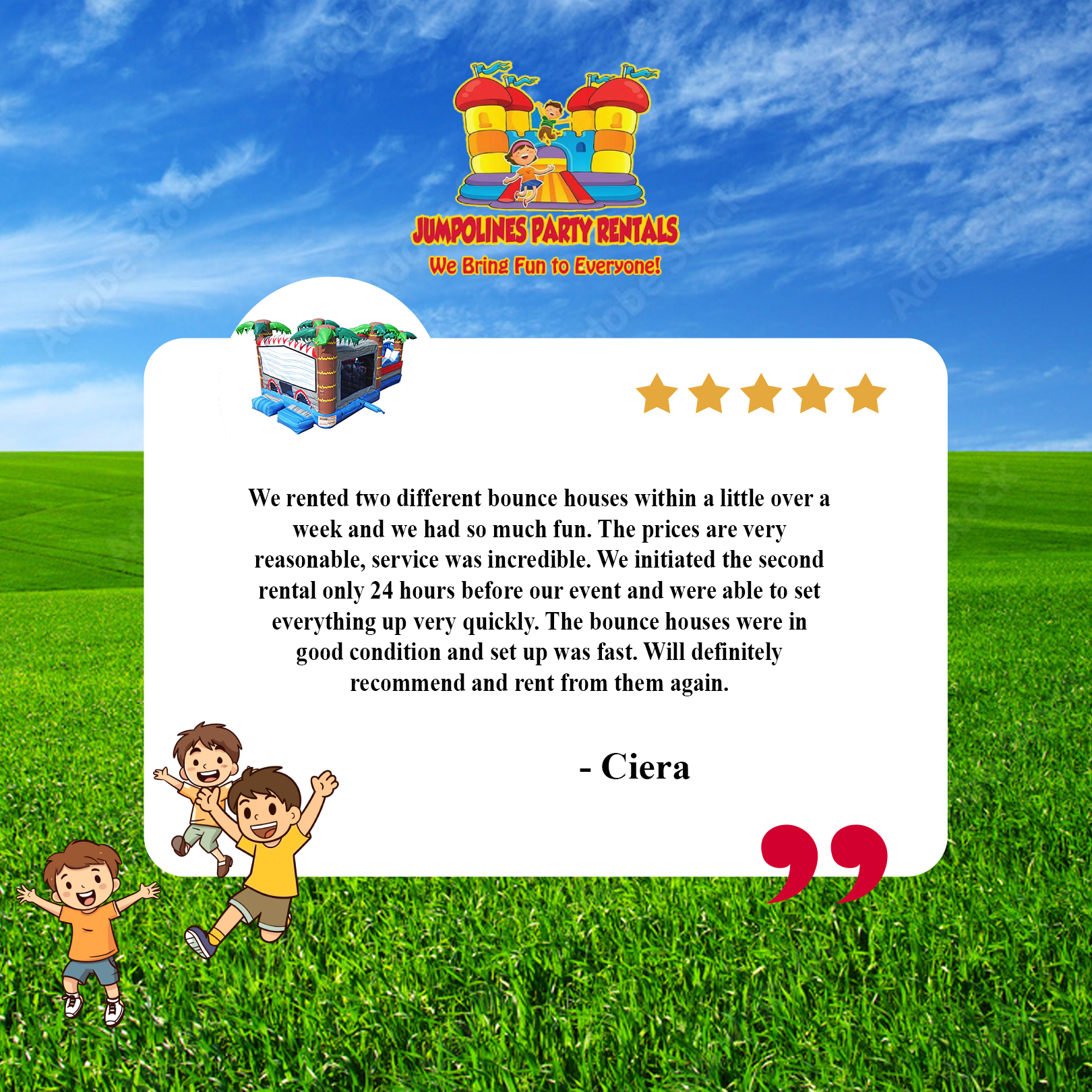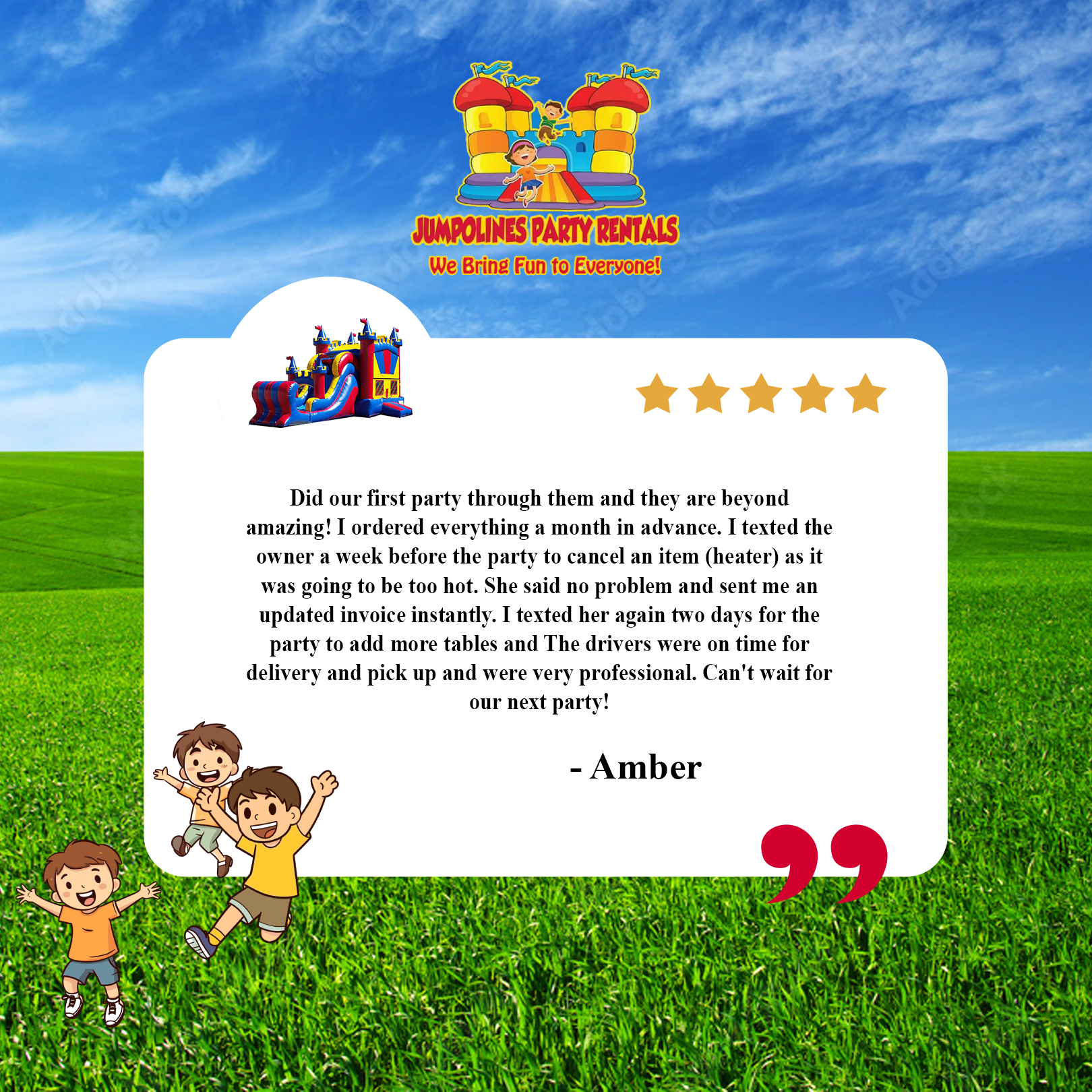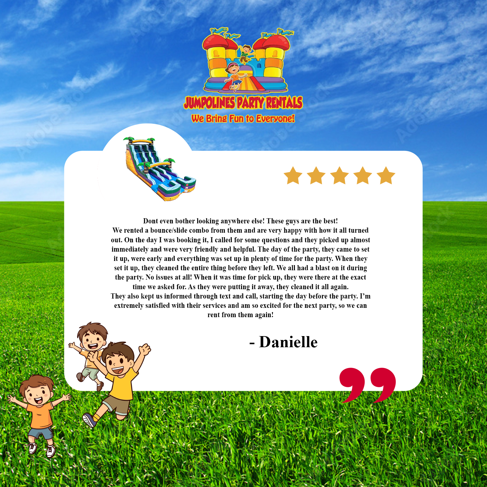 Jumpolines Party Rentals is awesome. Our customers agree. Here are a few testimonials from some of our satisfied customers: